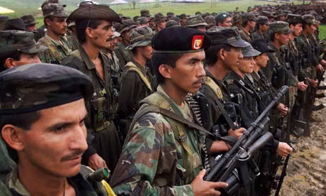The Guardian, May 11th, 2011, Venezuela attacks report suggesting ties between Chavez and FARC rebels. “The report claims that Venezuelan officials gave FARC rebels a haven, using them to train pro-government militias”. Photograph: Scott Dalton/AP