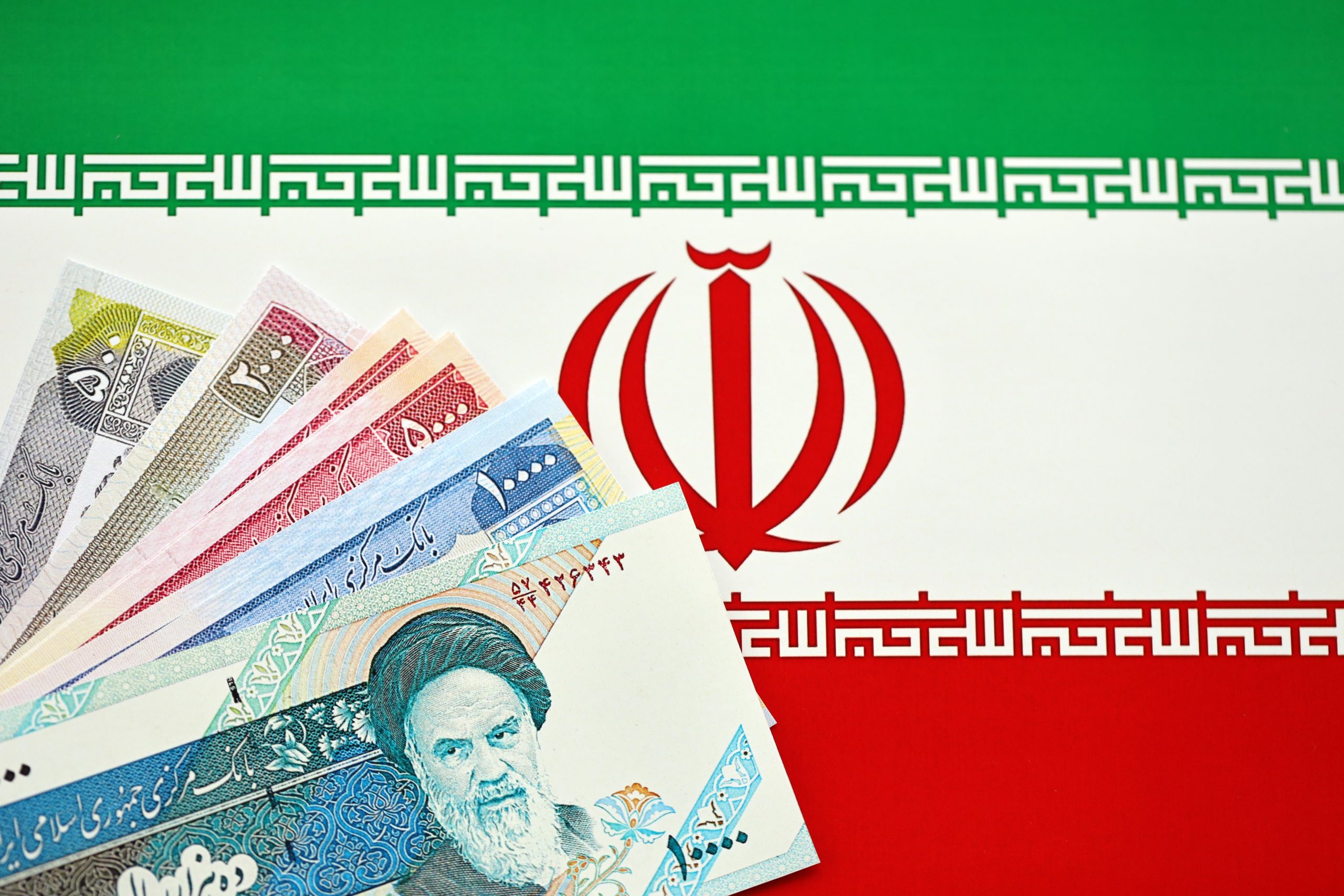 Close-up of a 50,000 Iranian rial banknote featuring Ayatollah Khomeini, illustrating Iran’s inflation, currency devaluation, and economic stagnation